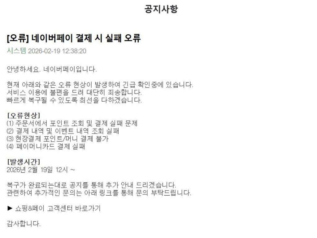 오늘(19일) 낮 12시부터 네이버페이 결제 실패 오류가 발생하면서 이용자 불편이 이어지고 있습니다.