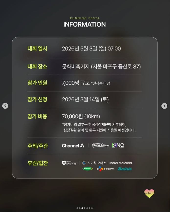 행사는 2026년 5월 3일 일요일 오전 7시에 시작되며, 서울 마포구 문화비축기지에서 진행됩니다. 종목은 10km 단일 코스로 운영되며, 총 2,000명 한정으로 모집됩니다. 참가비는 7만 원이며, 일부 금액은 한국심장재단에 기부되어 의미 있는 참여가 가능합니다.